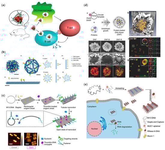 Based on targeted delivery, it is another important issue to study the carrying capacity of drug carriers. For example, the key issue in developing new vaccines is how to efficiently activate the antigen-specific B cells. It has been reported that the direct linking between adjuvants and antigens could induce a strong B-cell response [82]. Hence, in order to maximize vaccine immunogenicity, molecular complexes need rationally designing. To this end, Liu et al. performed the first evidence on DNA nanostructure-based vaccine construction. They designed tetrahedral DNA nanostructures to carry a mixture of antigen (streptavidin) and CpG adjuvants, and to precisely control the valence and spatial arrangement of carried elements (Figure 4a) [83]. In vivo experiments showed that the DNA-guided complex can lead to a strong and long-lasting antibody response without stimulating a reaction to the DNA nanostructure itself, which has important implications for the efficacy and development of vaccines. Apart from linking between adjuvants and antigens, multivalent antigens can also induce positive effects on the activation of B cells [84]. Based on this, a lot of research was reported [85,86], but some specific factors that affect the activity of B cells by antigens remain uncertain. In 2020, Veneziano et al. conducted experiments to explore the influence of antigens’ quantity, spacing and the involved rigidity of scaffolds on the activation of B cells (Figure 4b) [87]. They designed and constructed a hollow icosahedron and a rod-like six-helix bundle DNA origami to connect germline-targeting (GT) engineered outer domain (eOD), the antibody for HIV-1 envelope glycoprotein antigen gp120, on its corresponding spatial programmed positions. Through choosing and changing different connection sites, they realized independent control over antigen stoichiometry, nanoscale spatial arrangement of antigens. Consequently, the design criteria that could maximize early B-cell triggering were eventually identified according to the above-mentioned investigation. In addition to the complex geometry of the structural design, DNA nanorobots, a kind of DNA origami with dynamic mechanical functions, were also designed and widely used in precise drug delivery [88,89]. Li et al. constructed a kind of DNA nanorobot for the transportation of thrombin (Figure 4c) [90]. This DNA–protein combination can be directly transported to the tumor-related blood vessels through intravenous injection of this thrombin nanorobot, and activate intravascular thrombosis and tumor necrosis without activating the immune system. The DNA–protein nanostructures greatly enhanced the targeting of drugs, and the evaluation results presented a significant improvement in antitumor effect and safety.