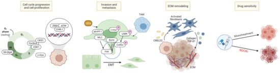 Cancer treatment strategies involving ROCK. ROCK is involved in multiple steps of the cell cycle and DNA damage response. ROCK further plays an important role in all stages of cancer cell metastasis including the formation of filopodia and lamellipodia, cytoskeletal reprogramming, EMT process, and the regulation of TME components. ROCK also activates pro-tumorigenic CAFs and increases the deposition of ECM components. This increase in ECM deposition promotes its stiffness and rigidity to exert tumor cell progression. Finally, ROCK inhibition combined with other chemotherapeutic agents can induce a synergistic antitumor effect.