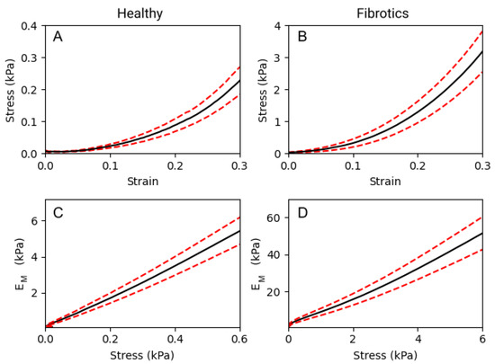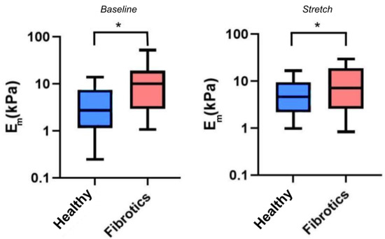 Unless stated otherwise, data is presented as mean ± SE. Statistical analysis was performed with JASP (JASP Team (2020), JASP (Version 0.14.1)). For multiple comparisons, one-way ANOVA and post hoc Tukey test for multiple comparison were used to calculate statistical significance. Pearson’s correlation was used to identify correlations between changes in measured under baseline and stretch states. ANCOVA test was used to compare the correlations obtained for fibrotic and healthy tissue. A p value < 0.05 was considered significant.
