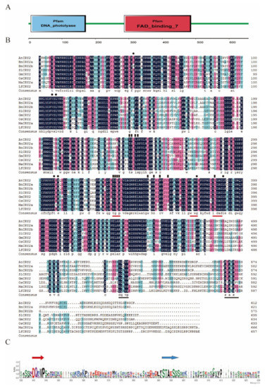 Analysis of LfCRY2 protein sequence. (A) Structural domains of the LfCRY2 protein. Analysis of protein sequences by SMART program. (B) Amino acid sequence alignment of cryptochrome proteins from Arabidopsis, Brassica napus, Solanum lycopersicum, Glycine max, Oryza sativa, and Musa acuminate. The alignment was constructed using DNAman version 5.2.2 software. Identical residues are highlighted by black boxes. Red lines under the sequences indicate the TGYP, WRWK, and LLDAD motifs. Black lines above the sequences indicate the DQMVP-E/D-STAESS (DAS) domain located in the C-terminal region. Residues that interact with FAD and MTHF are indicated by black rectangles and black dots, respectively. (C) DAS domain sequence logos. The sequence alignment of the domains was generated using ClustalX, and conserved motif logos were created using the WebLogo program (http://weblogo.threeplusone.com accessed on 31 October 2021).