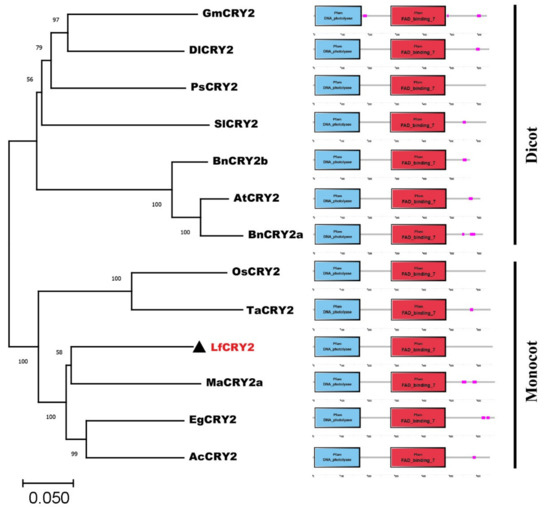 A phylogenetic analysis of CRY2 orthologs from 12 species was performed using the neighbor-joining method MEGA 11.0. Dicotyledons and monocotyledons were classified into two groups (Figure 2). The CRY2 orthologs from Arabidopsis, Brassica napus (JF303654 and JF303655) were classified in the dicotyledonous group. Glycine max CRY2 (DQ401047) was classified with the orthologs of Paeonia suffruticosa (ALB08478), Solanum lycopersicum (NM_001247316), and Dimocarpus longan (AHZ89699). LfCRY2 was grouped into the monocotyledonous group together with rice and wheat orthologs, but they were in different clades (Figure 2). LfCRY2 was classified with the Musa acuminate (APX43204), Elaeis guineensis (XP_010920471), and Ananas comosus (OAY72788) orthologs and showed the highest homology with Musa acuminate CRY2 (Figure 2). These results demonstrated that the phylogenetic tree was consistent with plant evolution. Moreover, in all 12 CRY2 orthologs, the N-terminal DNA photolyase domain and FAD-binding domain were conserved, while the C-terminal CCE domains were short and variable (Figure 2).