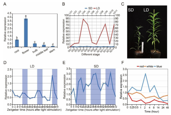 Analysis of LfCRY2 expression using real-time quantitative RT-qPCR. (A) LfCRY2 transcript levels in different tissues at the flowering stage under LDs (17.0 µmol m−2 s−1 white light, light/dark cycle of 16/8 h). (B) The stage-specific expression patterns of LfCRY2 in the leaves under different photoperiods. Developmental stages corresponding to each time point are as follows: LD1, 2–3 rosette leaves; LD2, 4–5 rosette leaves; LD3, 6–7 rosette leaves; LD4, 8–9 rosette leaves; LD5, 1–2 internodes (just bolting); LD6, 4–5 internodes; LD7, 7–8 internodes; LD8, 13–14 internodes; LD9, 15–16 internodes; LD10, 22–23 internodes; LD11, flowering; SD1, 2–3 rosette leaves; SD2, 4–5 rosette leaves; SD3, 6–7 rosette leaves; SD4, 8–9 rosette leaves; SD5, 10–11 rosette leaves; SD6, 12–13 rosette leaves; SD7, 1–2 internodes (just bolting); SD8, 3–4 internodes; SD9, 5–6 internodes; SD10, 7–8internodes; SD11, 9–10 internodes; SD12, 12–13 internodes; SD13, 16–17 internodes; SD14, 20–21 internodes. (C) Growth and development of L. × formolongi in different photoperiod. (D,E) The diurnal rhythm expression pattern of LfCRY2 under LDs and SDs. The shaded bars in each chart represent dark periods. (F) LfCRY2 transcript levels under different light quality during different irradiation time. Data points represent an average of three biological replicates with three technical replicates. Error bars represent the SD of three biological replicates.