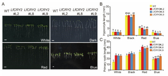 Comparison of the hypocotyl and root lengths of WT Arabidopsis and transgenic 35S::LfCRY2 lines. (A) Phenotypes of WT plants and three transgenic lines grown under darkness and blue, white, and red light conditions. The white dashed line indicates the boundary between hypocotyl and root. (B,C) Comparison of the hypocotyl and root lengths of WT plants and three transgenic lines grown under darkness and blue, white, and red light conditions. The scale bar represents 5 mm.