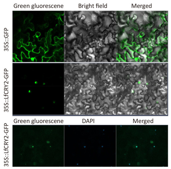 To investigate the sub-cellular localization of LfCRY2, the LfCRY2 open reading frame (ORF) without the termination codon was fused upstream of the GFP reporter under the control of the CaMV 35S promoter, and the plasmid containing GFP alone was used as a control. The construct and GFP alone were introduced into epidermal cells of tobacco leaves and observed under a confocal microscope. As shown in Figure 6, the fusion protein has strong fluorescent signals in the nucleus. The results implied that the LfCRY2 protein was targeted to the nucleus.