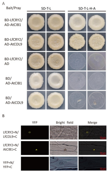 To determine whether the full-length LfCRY2 interacts with AtCIB1 or LfCOL9, GAL4 yeast two-hybrid assays were performed to investigate the protein–protein interactions by cotransforming yeast cells with a bait construct and a prey construct. After selecting synthetic defined media lacking threonine, leucine, histidine, and alanine (SD-TLHA), LfCRY2 was found to interact with AtCIB1 and LfCOL9, respectively, in yeast cells (Figure 7A).