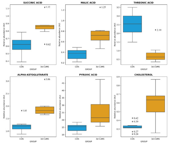 - Li, Z.-Y.; Zheng, X.-Y.; Gao, X.-X.; Zhou, Y.-Z.; Sun, H.-F.; Zhang, L.-Z.; Guo, X.-Q.; Du, G.-H.; Qin, X.-M. Study of plasma metabolic profiling and biomarkers of chronic unpredictable mild stress rats based on gas chromatography/mass spectrometry. Rapid Commun. Mass Spectrom. 2010, 24, 3539–3546. [Google Scholar] [CrossRef]