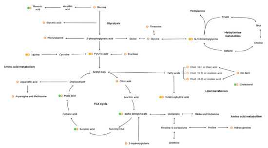 | Threonic acid | 2.55 ± 0.21 | 0.8 ± 0.17 | <0.01 | 0.03 | 2.6 | 0.03 | 0.3 | ↓ | Ascorbate and aldarate metabolism |