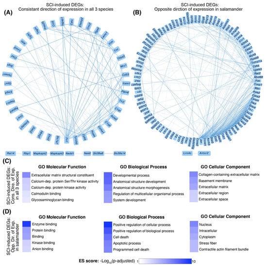 GO enrichment analysis of SCI-induced DEGs at 3/4 dpi. (A) The top five GO-Molecular Functions (MF), GO-Biological Processes (BP), and GO-Cellular Components (CC) enrichment scores for the 61 orthologs with a consistent direction of expression in all three species. The most enriched terms include those belonging to the extracellular matrix constituent (p-adj. = 1.10 × 10−6, ES score = 5.96) and development (“anatomical structure development”, p-adj. = 4.78 × 10−8, ES score = 7.32). (B) GO-MF, GO-BP, and GO-CC enrichment scores for the 119 orthologs with an opposite direction of expression in salamanders. The most enriched terms are related to intracellular components (“nucleus”, p-adj. = 6.44 × 10−7, ES score = 6.19) and positive regulation of apoptotic processes, such as “cell death” (p-adj. = 8.56 × 10−8, ES score = 7.06). Enrichment scores are calculated as the -log10 of the adjusted p-value. (C,D) STRING protein-protein network analysis in Cytoscape app. (C) Network analysis for SCI-induced DEGs with the consistent direction of expression in all four studies. (D) Network analysis for SCI-induced DEGs with opposite directions of expression in salamanders.