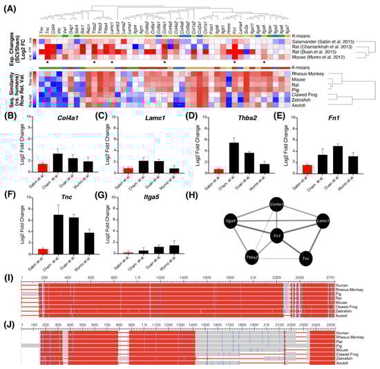 ECM-receptor interaction pathway (KEGG ID: mmu04512) contained the greatest number of orthologs with consistent direction of expression in all four studies (p-adj. = 0.003, ES score = 3.51). (A) Orthologs that were expressed in all four studies were included in the top heatmap, and Mus musculus was used as the reference organism. Asterisks (*) indicate genes that were significantly differentially expressed after SCI (p-adj. ≤ 0.05) in all four studies. Based on cosine similarity, the species were hierarchically clustered, and the genes were classified via K-Means into four groups. Additionally, the genes were ordered according to evolutionary distances as determined by the phylogenetic tree, which was constructed via the neighbor-joining method in MEGA X. The bottom heatmap compares the relative amino acid percent sequence identity of each gene across the species commonly used in SCI studies. K-means based on cosine similarity was used to classify the bottom heatmap into six groups. (B–G) The selected bar graphs depict the log2FC values for orthologs that were significantly differentially expressed after SCI in all four studies (p-adj. ≤ 0.05), including in salamanders (depicted in red). Data represented in Log2FC ± 95% confidence interval. (H) The protein-protein interaction for the six SCI-induced DEG with consistent direction of expression. (I,J) COBALT multiple sequence alignment for fibronectin 1 and tenascin c proteins, respectively. Conserved amino acid sequences are shown based on the relative entropy threshold of the residue. Red indicates high conservation and blue indicates lower conservation, whereas grey indicates amino acids in positions that are not conserved. Only regions with no gaps are colored.