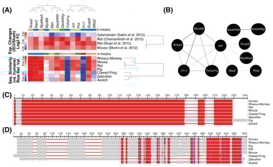 For the 119 orthologs with a different direction of expression in salamanders, the top-most affected pathway was that of “mitogen-activated protein kinase (MAPK) signaling” (KEGG ID: mmu04010, p-adj. = 6.01 × 10−5, ES score = 4.22) (Figure 4A and Figure S2). The orthologs in this pathway that were significantly differentially expressed after SCI (p-adj. ≤ 0.05) in all four studies include Rras2 (Ras-related protein, R-Ras2), Rps6ka3 (ribosomal protein S6 kinase), Myc (Myc proto-oncogene), Fos (Fos proto-oncogene), Tnfrsf1a (TNF receptor superfamily member 1A), Il1r1 (interleukin-1 receptor type 1), Rac2 (Rac family small GTPase 2), Myd88 (myeloid differentiation primary response protein), Gadd45b (growth arrest and DNA damage-inducible protein), Gadd45g, Jun (Jun proto-oncogene), Dups6 (dual specificity phosphatase 6), and Nfkb2 (nuclear factor kappa beta subunit 2) (Figure 4A). Across the four studies, these 13 orthologs were consistently downregulated in salamanders, and upregulated in rats and mice (with log2FC values ranging from −0.23 to 4.69). Within these orthologs, Jun shows the greatest protein-protein interaction network (Figure 4B).