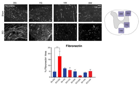 The presence of fibronectin (expressed by Fn1) in Wistar rat thoracic spinal cords at 3 dpi compared to time-matched laminectomized shams (n = 5 per cohort). The images were taken at the dorsal horn grey (DG), ventral horn grey (VG), dorsal horn white (DW), ventral horn white (VW) matter. Data represented as mean +/− SEM and analyzed using two-way ANOVA with Holm-Sidak multiple comparison test. *** indicates p-adj. < 0.001.