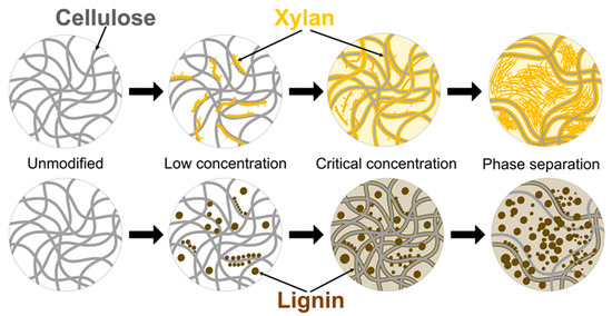 - Liu, L.; Cui, B.; Tan, L.; Wang, W. Improving the combination of cellulose and lignin using xylan as a compatibilizer. Cellulose 2021, 28, 5335–5349. [Google Scholar] [CrossRef]