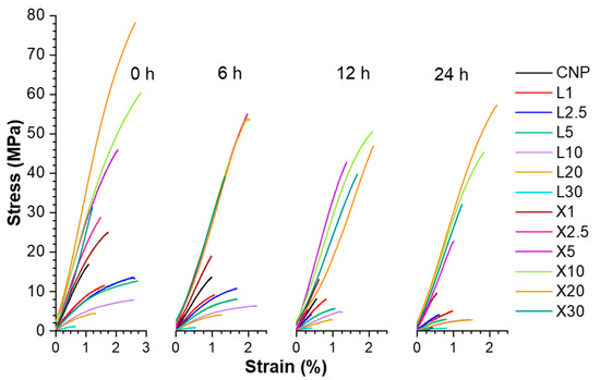 Representative stress–strain curves of NP for pristine and aged samples at different times of UV irradiation at 80 °C temperature. Lignin (L) and xylan (X) with their loading in wt%. E.g., X1 sample corresponds to NP with 1 wt% xylan and 99 wt% NFC loadings, L1 sample—lignin 1 wt% and NFC 99 wt%.