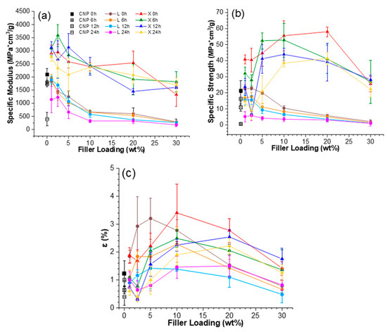 Tensile properties: (a) specific elastic modulus, (b) specific ultimate tensile strength, and (c) elongation at break for NPs saturated under different RH.