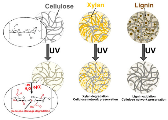 Hemicellulose can refer to various heteropolymers usually formed in different ratios in various plants and trees [17,18]. Xylan is one of the most abundant types of hemicellulose, and it is characterized by low oxygen permeability [19]. Thus, xylan can be used as an additive to protect material in a thermo-oxidative environment. Lignin is often regarded as a natural defense against UV radiation, as indicated by oxidation studies for papers, woods, and natural industrial fibers [20,21,22]. The oxidation starts with lignin, where β-O-4 linkage will likely undergo cleavage and produce free radicals [23]. After lignin oxidation, various oxidative reactions occur for cellulose hydroxyl groups at C(2), C(3), and C(6) atoms in a glucopyranose unit [24]. This leads to the formation of carbonyl groups as single ketones or conjugated diketones at C(2) and C(3) or aldehydes/carboxyls at C(6) [25,26,27]. If water participates in the oxidation process, glycosidic bond cleavage can occur at C(1) [24]. It has been reported that cellulose fibers without lignin degrade significantly faster, thus leading to a shorter material lifespan [21,28]. Due to xylan possessing a similar carbohydrate structure, it follows similar degradation routes.
