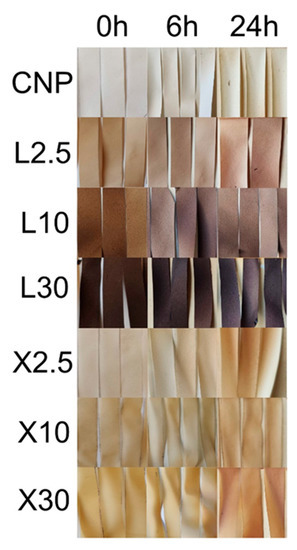 As shown in Figure 5, UV-VIS spectroscopy takes advantage of the induced color changes in NPs after aging them in UV irradiation and heat. The presence of oxidizable groups results in color change [55,56]. Visual changes show CNP changed color from white to white with a yellow tint, brown lignin NPs experienced whitening, and xylan NPs changed from yellow to a light brown color. This loss of color (whitening) for cellulose materials has been reported in the literature and indicates lignin degradation [23,57,58]. The yellow tint observed for CNP indicated an oxidation of cellulose [59,60].