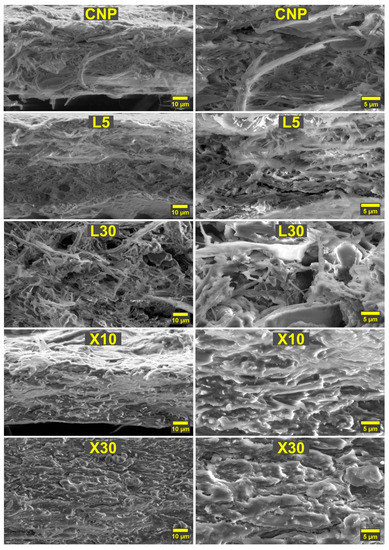 In contrast, the addition of xylan to CNP showed a densely packed structure with no visible pores or voids in the structure of X10. Our observations coincide with the literature, where xylan shows the ability to fill gaps between cellulose fibers and improve properties in low loadings [49,50]. The smaller molecular weight and more branched structure contribute to xylan’s ability to insert itself into gaps between cellulose fibers and coat them. In addition, xylan effectively enhances the hydrogen bond network of cellulose; thus, there is no visible separation between xylan and cellulose in X10 NP. At the same time, X30 NP shows clear phase separation, and xylan forms visible layers of interphase. Individual cellulose fibrils are almost indistinguishable, while the highly dense structure remains. Thus, thick interphase layer formation results in poor mechanical performance due to disrupted load transfer in the cellulose network [51,52]. Xylan’s ability to form dense structures with no visible pores could be used to improve gas barrier properties either by addition or through coating means [38].