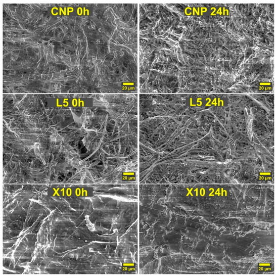 The L5 NP after aging shows a rather interesting change with the introduction of small holes throughout the surface. The interconnected network of cellulose fibers is severely damaged, but it remains in better condition than CNP. Lignin particles could coat cellulose fibers and significantly reduce the cracking due to efficient irradiation absorption as indicated by higher magnifications in the Supplementary Materials (Figures S1 and S2). Overall, the L5 composition follows a similar route to CNP, with the drastic increase in surface roughness and separation of individual fibers. Lignin could not last a full 24 h and, as indicated by tensile tests, it seemed to fail between 12 and 24 h. In the case of xylan NP, it can be observed that the surface remained relatively smooth, with the top layer experiencing significant degradation, as revealed by no visible fibers in the aged surface. This could be explained by cellulose and xylan degradation products remaining on the surface and forming a protective layer.