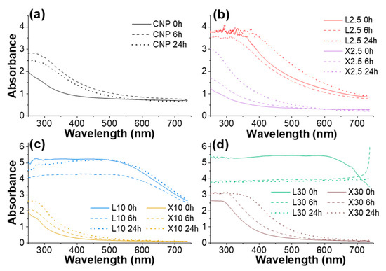 UV-vis spectra of NPs before and after aging 6 h and 24 h: (a) CNP, (b) L2.5 and X2.5, (c) L10 and X10, (d) L30 and X30.