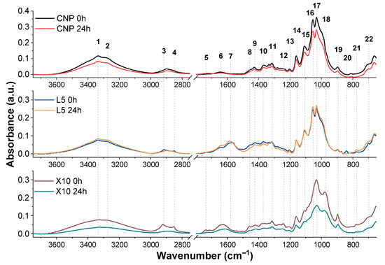 FTIR spectra of CNP, L5, and X10 samples before and after 24 h UV irradiation. The FTIR region between 1800 and 2800 cm−1 is emitted because it lacks any significant bands.