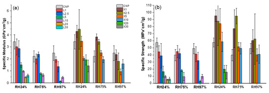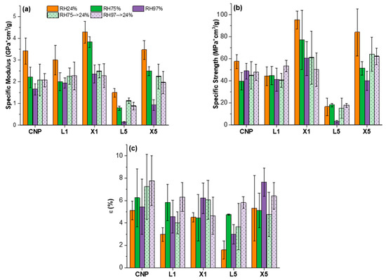 Tensile properties: (a) specific elastic modulus, (b) specific ultimate tensile strength, and (c) elongation at break of CNP, L1, L5, X1, and X5 NPs at different RH (24%, 75%, 97%) and their properties retention after moisture desorption.