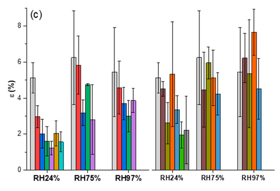 The hydrophilic nature of cellulose results in strong interactions with water molecules. This interaction yields strong plasticizing and swelling effects on cellulose-based structures [70,71,72]. As a result, intermolecular bonds between cellulose and cellulose or fillers are reduced and replaced with hydrogen bonds formed with water molecules. Plasticizing leads to reduced stiffness (elastic modulus) and decreased intermolecular bonds between components, lowering the tensile strength. However, in the case of elongation, slippage between fibers is improved, yielding higher strain values [73]. High moisture content promotes swelling, and as a result, the volume of NPs is affected by the internal expansion that results in a significant decrease in all tensile (mechanical) properties. This was observed for samples L5 and L10 at RH97%. Cazón et al. also reported that bacterial cellulose films showed a strong dependence on moisture content [74]. According to the authors, Guo et al. studied four types of nanocellulose and their equilibrium moisture content, which can significantly vary and depend on cellulose structure and crystallinity [72].