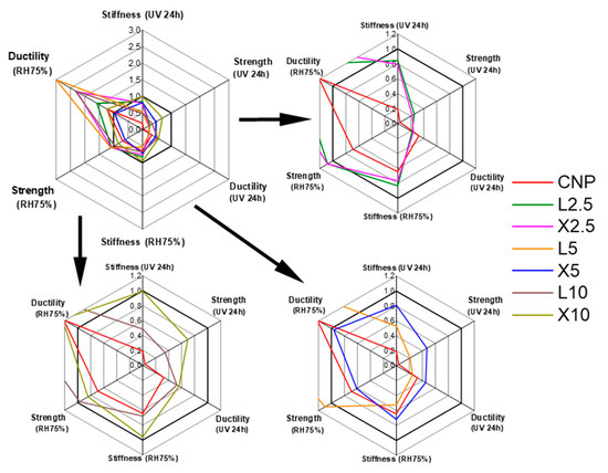 As shown in Figure 13, a radial plot displays NP performance multivariate observations with the most desirable variables of durability characteristics—stiffness (modulus), strength, and ductility (elongation) at 24 h of UV light and RH75% aging. The relative changes in tensile properties for modified NPs before and after aging are shown, where UV irradiated dry samples and samples saturated at RH24% were chosen as the reference. The unaged NP represents value 1 on the plot. The performance quality of the NP was enhanced after cellulose interface modification with the bio-based additives of xylan and lignin.
