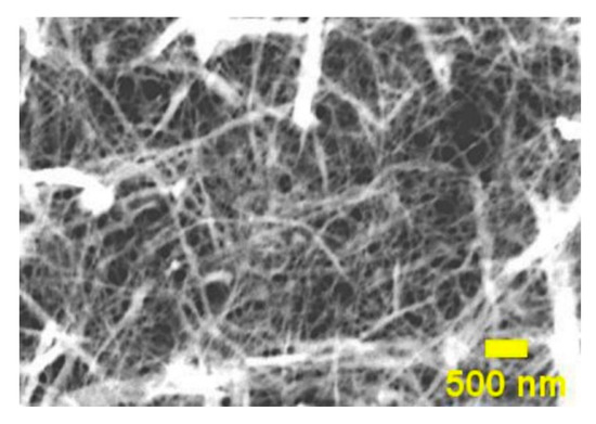 A suspension of 1 wt% nanofibrillated cellulose (NFC) was prepared in deionized water (DI). The obtained aqueous suspension was mixed in an ordinary kitchen blender (800 W, 5 min) and then homogenized with the high shear mixer L5M-A (Silverson Machines LTD, Chesham, UK) for 3 min (5500 rpm). After homogenization, it was processed with a microfluidizer (LM20, Microfluidic, Westwood, MA, USA) equipped with an H210Z (200 µm) chamber. Even defibrillation was achieved using 5 cycles. The microfluidizer pressure was set to 30,000 psi. Scanning transmission electron microscope (STEM) FEI Nova NanoSEM 650 Schottky field emission scanning electron microscope (FESEM) was used at acceleration voltage 10 kV to obtain an image of NFC suspension. The sample was prepared from a diluted NFC suspension droplet, which was placed on a copper grid, and water was allowed to evaporate; the obtained image is shown in Figure 14.