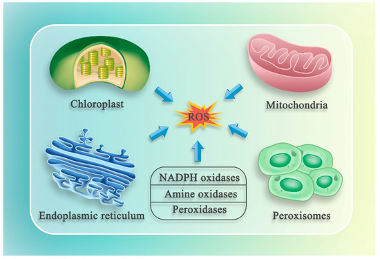 Intracellular ROS are generated from many sources. Several organelles, including mitochondria, chloroplasts, endoplasmic reticulum (ER), and peroxisomes, produce ROS. In addition to these organelles, new sources of ROS, such as NADPH oxidases, amine oxidases, and peroxidases, have been identified in plants [15,21,22] (Figure 1).