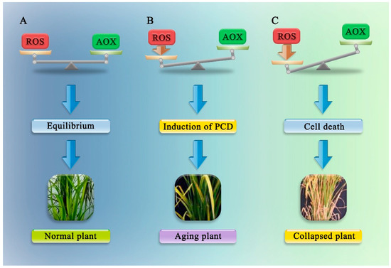 The regulatory network in plant cells that balances redox metabolism by controlling the release of ROS. Some disturbances in equilibrium lead to an increase in the intracellular ROS levels, which can cause damage to cells and induce cell death. (A) ROS = AOX, equilibrium; (B) excess ROS causes the induction of PCD; (C) excessive ROS levels cause cell death. AOX: antioxidants.