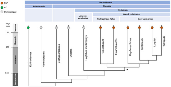 A simplified phylogenetic tree of deuterostomia showing the composition of animal skeletons (CaP: calcium phosphate; CC: calcium carbonate, or unmineralized). Bony vertebrates and cartilaginous fishes are the dominating living vertebrates (gnathostomes, 99.9%). Cartilaginous fishes produce dermal skeleton, including teeth dermal denticle and fin spine, but not endochondral bone as bony vertebrates. Lampreys and hagfishes (cyclostomes) lack, however, mineralized tissues. The emergence of hinged jaws and the mineralized skeleton, indicated by (*), is a major event in the evolution of vertebrates. Adapted from [6]. The composition of the mineral phase was found in [5].