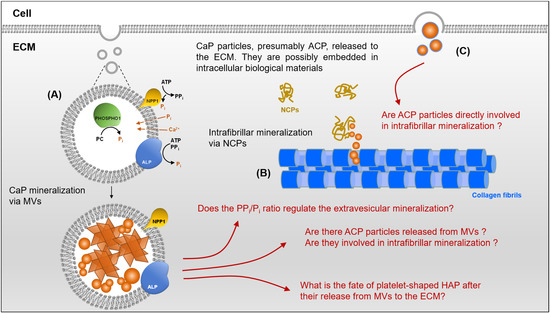Schematic presentation depicting the “grey areas” regarding the biogenic formation of CaP mineral in the extracellular matrix (ECM). (A) Mineralization initiated by matrix vesicles (MVs) by (i) the enzymatic generation of Pi, (ii) the regulation of their Pi/PPi ratio, (iii) intravesicular accumulation of Pi and Ca2+ and (iv) formation of ACP mineral (spheroid particles) that crystallize to form HAP platelets. The mechanism of transport of CaP ion precursors, Pi and Ca2+, indicated by arrows and dashed lines, involves phosphate transporters [101] and annexins [102], respectively, which are not shown. (B) Intrafibrillar mineralization mediated by non-collagenous proteins (NCPs). (C) Release of presumable ACP particles from the cytosol to the ECM.