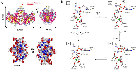 (A) Three-dimensional structure of ALP (PDB, code “P19111”). Different views showing the dimensions of the homodimer and the distribution of the superimposed residues, Glu (in blue) and Asp (in red) amino acids (adapted from [118]). (B) Mechanism of the enzymatic process (adapted from [117]). Only a few hydrogen atoms have been represented. During the first step, (i → ii), the hydroxide ion bound to the magnesium ion deprotonates the oxygen gamma of Ser102. During the same step, the phosphomonoester substrate (ROP) binds to the two zinc ions and to the guanidinium group of Arg166. Then, during (ii → iii), the deprotonated gamma oxygen of Ser102 acts as the nucleophilic group in the substitution where RO- is the leaving group. Then, during (iii → iv), a hydroxide ion enters the enzymatic site and is coordinated to Zn1. It then attacks the phosphorus atom of the phosphoserine that had been generated in the previous step through a nucleophilic substitution where the gamma alkoxide of Ser102 is the leaving group. Finally, during (iv → i), the alcohol is regenerated on the serine, as well as the hydroxide ion on the magnesium ion. During this last step, a Pi ion is generated.