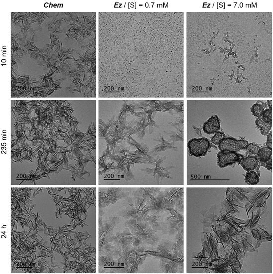 In Figure 5, TEM micrographs of systems obtained for different initial conditions after various delays are presented as an example of differences between enzymatic and non-enzymatic mineralization, with initial conditions of [Ca2+] = 11.4 mM, pH = 7.4 and T = 37 °C. Without enzymes (Chem), platelet-shaped particles are already obtained after 10 min and, afterwards, seem to only mature with time, without drastic evolution. With the ALP enzyme, only small clusters (around 10 nm in diameter) are visible after 10 min. They form eventually more or less crystallized platelets but after going through intermediate phases that depend on the initial substrate concentration, [S]. For [S] = 0.7 mM, the objects formed in solution yield poorly crystallized platelets after 235 min that mature slowly with time. For [S] = 7 mM, another type of intermediate can be observed after 235 nm, which displays a rather amorphous core-shell structure from which platelet-shaped particles seem to form. This highlights the interesting influence of the initial substrate concentration on the crystallization pathway followed during the mineralization through the control of the enzymatic activity.