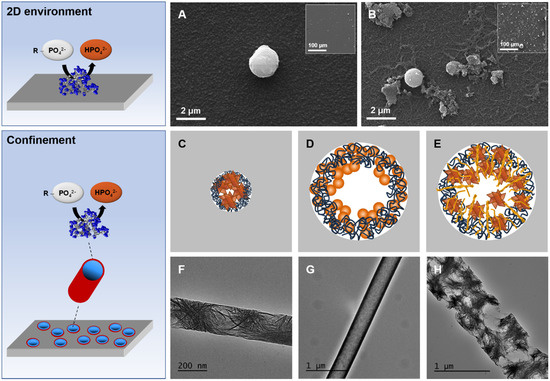 - Colaço, E.; Lefèvre, D.; Maisonhaute, E.; Brouri, D.; Guibert, C.; Dupont-Gillain, C.; El Kirat, K.; Demoustier-Champagne, S.; Landoulsi, J. Enzyme-assisted mineralization of calcium phosphate: Exploring confinement for the design of highly crystalline nano-objects. Nanoscale 2020, 12, 10051–10064. [Google Scholar] [CrossRef]