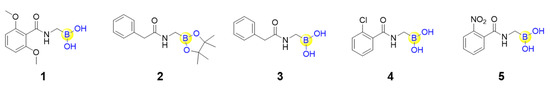 - Silva, M.P.; Saraiva, L.; Pinto, M.; Sousa, M.E. Boronic Acids and Their Derivatives in Medicinal Chemistry: Synthesis and Biological Applications. Molecules 2020, 25, 4323. [Google Scholar] [CrossRef]