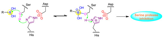 Inhibition mechanism of peptide boronic acids against serine protease.