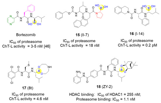 Li’s group designed and synthesized six dipeptide proline-boronic acids and fourteen tripeptide proline-boronic acids as proteasome inhibitors, with the aim of overcoming the problems of metabolic instability and dose-limiting toxicities that exist in bortezomib and its analogues with a peptide backbone [46,47]. As a result, compound II-7 (15), which bears an N-terminal Cbz group, was demonstrated to be the strongest inhibitor with an IC50 value of 9.8 nM against human gastric carcinoma MGC803 cells (Figure 5). Further examination of the anti-tumor spectrum of II-7 showed comparable inhibitory activity against several different tumor cells lines with bortezomib (Figure 1 and Figure 5). II-7 was also confirmed to display high subunit selectivity towards the chymotrypsin-like (ChT-L) activity of the proteasome (IC50 = 18 nM), implying that it may have low off-target effects [47]. Furthermore, a novel class of urea-bearing peptide boronic acids were also designed and synthesized as potent proteasome inhibitors [48]. Further optimizations resulted in the cyclized 1,2,3,4-tetrahydroisoquinoline derivative I-14 (16) as the most potent compound (Figure 5). I-14 showed very strong inhibitory activity against proteasome ChT-L activity with an IC50 value below 1 pM and comparable potency against several different tumor cell lines as well as an improved pharmacokinetic profile when compared to bortezomib. Although I-14 exhibited slightly lower potency in inhibiting tumor growth in a Bel7404 mouse xenograft model than bortezomib, it demonstrated relatively low toxicity, suggesting I-14 as a promising drug candidate [48].