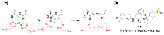HIV-1 protease is an aspartic acid protease which is identified to be crucial for viral replication. As a competitive inhibitor of HIV-1 protease, darunavir has been approved by the Food and Drug Administration (FDA) and demonstrated to be highly efficacious in suppressing HIV-1 replication, dramatically contributing to the lifetime of HIV/AIDS patients [51]. Raines’s group recently replaced an aniline moiety in darunavir with a phenylboronic acid, resulting in a new derivative, 19, with 20-fold greater affinity for the protease (Figure 6) [52]. X-ray crystallography confirmed that this boronic acid moiety makes three hydrogen bonds with HIV-1 protease, and even maintains its hydrogen bonds and its affinity toward the D30N variant of HIV-1 protease, which normally endows drug resistance. Furthermore, density functional theory analysis suggested that the short hydrogen bonds between the hydroxyl groups of the boronic acid and Asp30 (or Asn30) are covalent reversible bonds [52]. Although the antiviral activity in cell-based assays was assessed to be less potent than darunavir, possibly due to the low cell permeability, the boronic acid group might still be regarded as a versatile functional group in the design of small-molecule ligands [52,53].