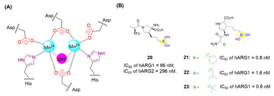 Arginases, a class of metalloproteases comprising two isoforms, ARG-1 and ARG-2, are responsible for converting L-arginine into L-ornithine and urea in the urea cycle (Figure 7A). The overexpression of arginase tends to lead to the depletion of arginine followed by suppression of T and NK cell growth, resulting in the tumor’s escape of the immune response [54]. Thus, it is expected that anti-tumor immune responses might be enhanced through the inhibition of arginase. A series of dipeptide boronic acids as arginase inhibitors were identified with the aim of improving the pharmacokinetic profile. Numidargistat (20) is a highly potent arginase inhibitor currently tested in phase 1/2 clinical trials for the treatment of patients with solid tumors malignancies (Figure 7B) [54]. Significant inhibition of human ARG-1 was recently observed for compounds 21, 22, and 23, which exerted high potency with IC50 values of 0.8 nM, 1.6 nM and 0.8 nM, respectively (Figure 7B) [54].