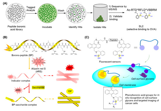 Recognition of glycans using peptide boronic acids: (A) Identification of boronic acid functionalized peptidyl synthetic lectins (SLs) using a combinatorial library; (B) The borono-peptide (BP) and BP-induced nanofibrous indicator (NFI) for cancer cell detection; when encountering saccharides on cancer cell surfaces, the eye-detectable fluorescence change could be induced from its coordination state between ARS and boronic acid group to its free state; (C) Boronic acid-functionalized peptide-based fluorescent sensors that are able to recognize and discriminate the cancer-associated glycans as well as cancer cell lines.