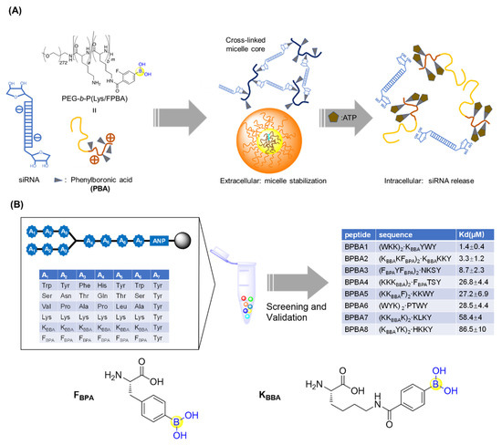 (A) Phenylboronic acid-functionalized peptide for siRNAs delivery; (B) Screening of branched peptide boric acids targeting RNA.