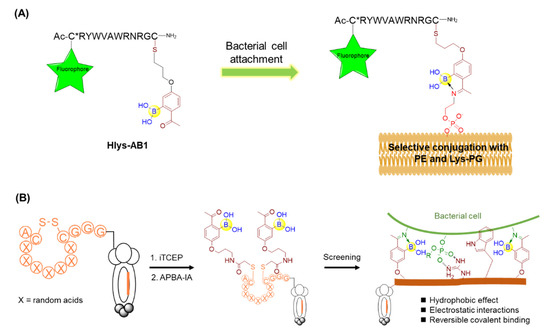 Furthermore, Gao and coworkers constructed a phage display library of peptides bearing two 2-acetylphenyl-boronic acid (APBA) moieties capable of reversible covalent binding to the biological amines on the bacterial cell surface via the dynamic formation of iminoboronates (Figure 10B) [64]. Panning the library directly against the live bacterial cells, including Staphylococcus aureus and Acinetobacter baumannii, provided submicromolar and highly selective peptide binders. Intriguingly, parallel screening by a control library that was unmodified by APBA failed to give potent peptide binders, demonstrating the integral nature of the APBA modifications. Furthermore, the identified peptides were found to be a promising delivery vehicle for eosin, a phototoxin that can trigger the production of reactive oxygen species (ROS) and subsequently kills cells in close proximity upon photoirradiation [64]. Importantly, little or no mammalian cell toxicity was observed with or without photoirradiation. It should be noted that the phage displayed peptides bearing APBA groups could reach up to 109 unique peptide sequences, offering huge diversity and the capacity to screen peptide boronic acids. These results clearly demonstrate the feasibility of discovering species-specific antibiotics using an APBA-modified peptide library and paved a facile strategy for the discovery of novel antibiotics in future.
