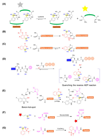 (A) Cysteine detection using chemoselective imidazolidino boronate (IzB)-cyclized peptide; (B) N-Terminal cysteine modification through TzB mediated acyl transfer reaction; (C) Conjugation of N-terminal cysteine (NCys) with 2-formylphenylboronic acid (2-FPBA) to afford a thiazolidine boronate (TzB) complex; (D) Coupling of AEP ligation with N-terminal cysteine trapping by 2-FPBA; (E) Site-selectively installing an iminoboronate using a boron hot-spot (BHS) strategy; (F) Modification of peptide using alkenyl boronic acid and sodium ascorbate; (G) Copper-mediated site-selective peptide arylation at the N-terminus.