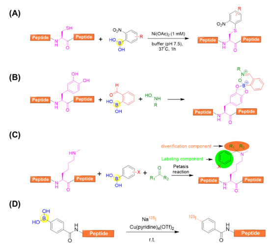 (A) A nickel (II) salt-promoted cysteine arylation on peptides using 2-nitro-substituted arylboronic acids reagents; (B) A three-component assembly for the purpose of labeling peptides containing L-dihydroxyphenylalanine (L-DOPA) in one pot; (C) Peptide side-chain derivatizations Nε-Me-Lysine residue by means of the Petasis (Borono–Mannich) reaction; (D) Direct radiolabeling of peptides via copper-mediated radioiodination using an aryl boronic acid precursor.