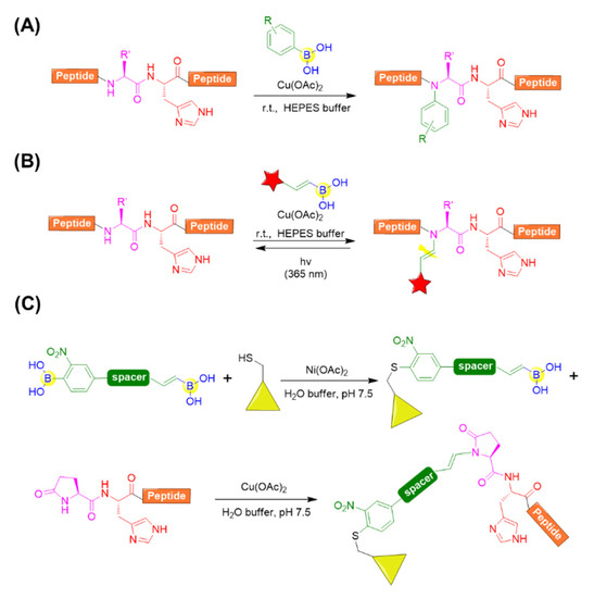 Further, Ball’s group applied the backbone N−H alkenylation for a photocleavable backbone N−H modification, which allowed the efficient photocaging of folding and function of peptides or proteins (Figure 15B) [87]. A variety of peptides, including angiotensin I, a chymotrypsin substrate peptide (CSP), leuprolide, and a collagen mimetic peptide (CMP), were chosen and evaluated for the photocaging process. Clearly, the peptides could be converted to backbone-modified products using boronic acid reagents in the presence of a copper (II) salt and regenerated to the uncaged peptides upon irradiation with 365 nm light (Figure 15B) [87]. Very recently, they also developed a molecule with two boronic acid functional groups, which could be subjected to nickel (II) salt-catalyzed cysteine arylation followed by histidine-directed alkenylation mediated by copper (II) salt (Figure 15C). This enables the preparation of stapled peptides, peptide-protein conjugation, etc. [88].