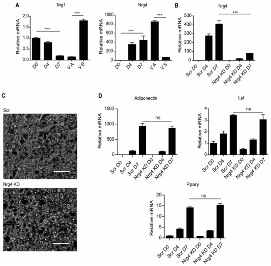 2.1. Nrg4 Deficiency Has No Effect on Differentiation of 3T3-L1 PRE-Adipocytes