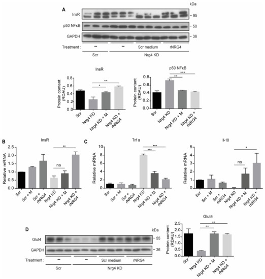 2.4. Treatment of Nrg4 KD Adipocytes with Conditioned Medium from Control Adipocytes or with Recombinant Nrg4 Reverses Inflammation and Restores Insulin Receptor and Glut4 Content