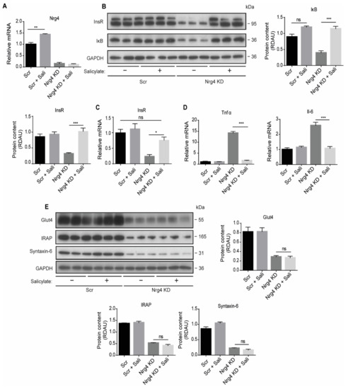 2.5. Sodium Salicylate and Dexamethasone Restore the Expression of the Insulin Receptor, but Not the Content of Glut4 Protein in Nrg4 KD Adipocytes