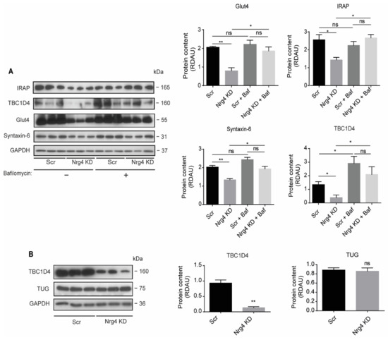 2.7. Blockade of Autophagy Restores Glut4 and GSV Proteins Content in Nrg4 KD Adipocytes